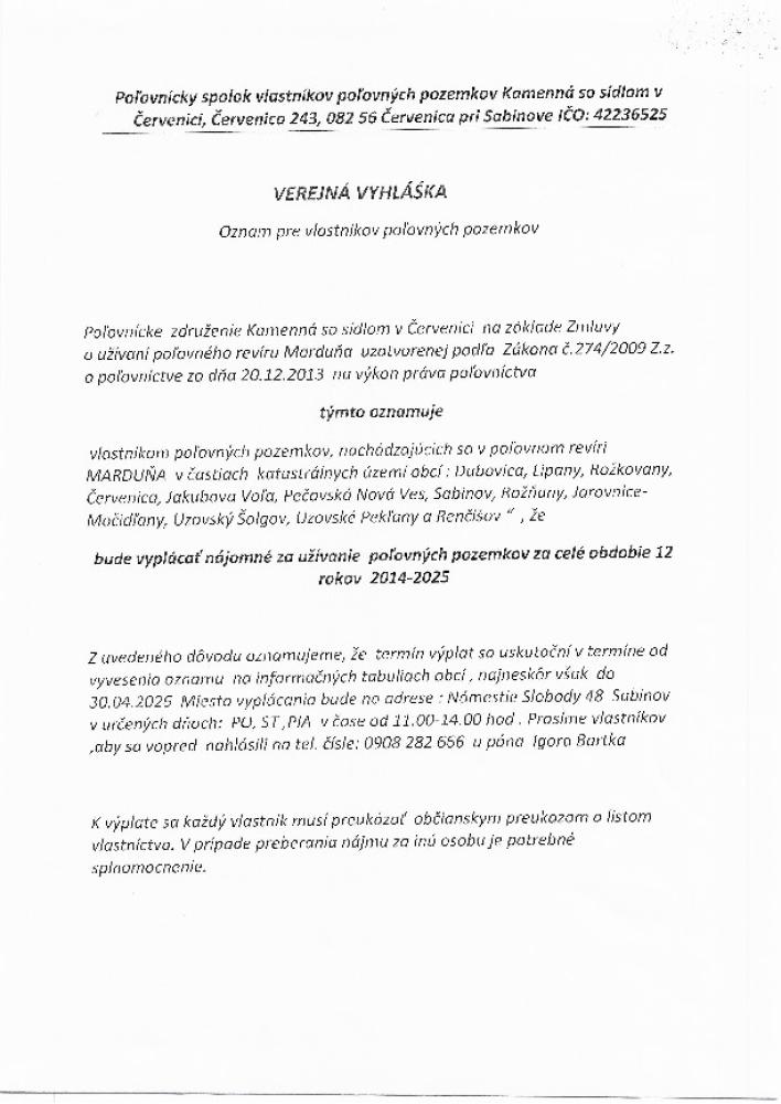 Verejná vyhláška - Poľovnícke združenie KamennáVyplácanie nájomného za užívanie poľovných pozemkov za celé obdobie 12 ... Čítaj ďalej