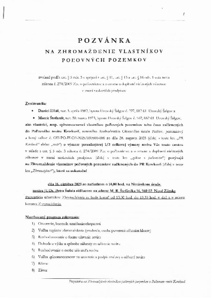 Pozvánka na zhromaždenie vlastníkov poľovných pozemkov